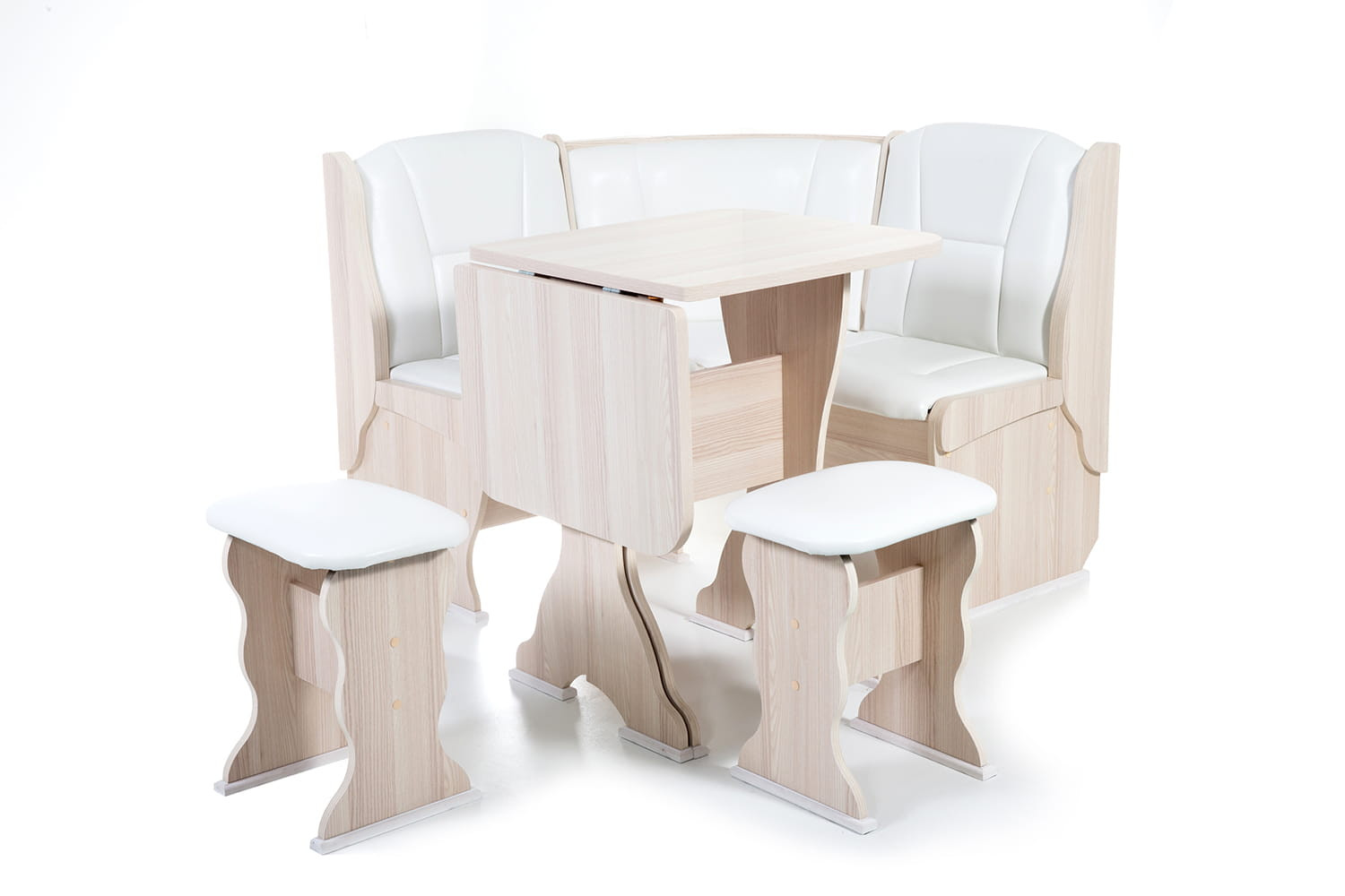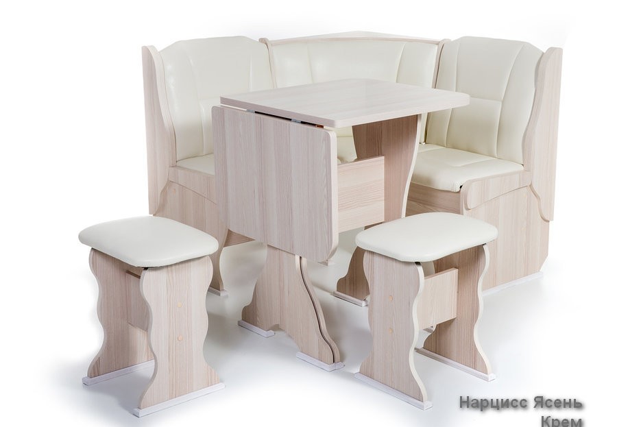 Особенности уголка: Поможет обустроить комфортную обеденную зону без лишних затрат. В гарнитур входит угловой диван, два табурета и раскладной стол. В угловой части дивана есть удобная полочка, на которую можно поставить нужные вещи. Под сидениями находятся вместительные ящики для хранения. Имеет термостойкую пластиковую столешницу. Угол собирается как в правом, так и в левом исполнении. Размеры: Размер угловой скамьи: ш(1080х1080)хг530хв880 мм. Размер стола: ш625(1000)хг580хв750 мм. Размер табурета: ш380хг300хв450 мм. Высота уголка: 880 мм. Высота посадки скамьи: 465 мм. Высота табурета: 450 мм. Высота стола: 750 мм.