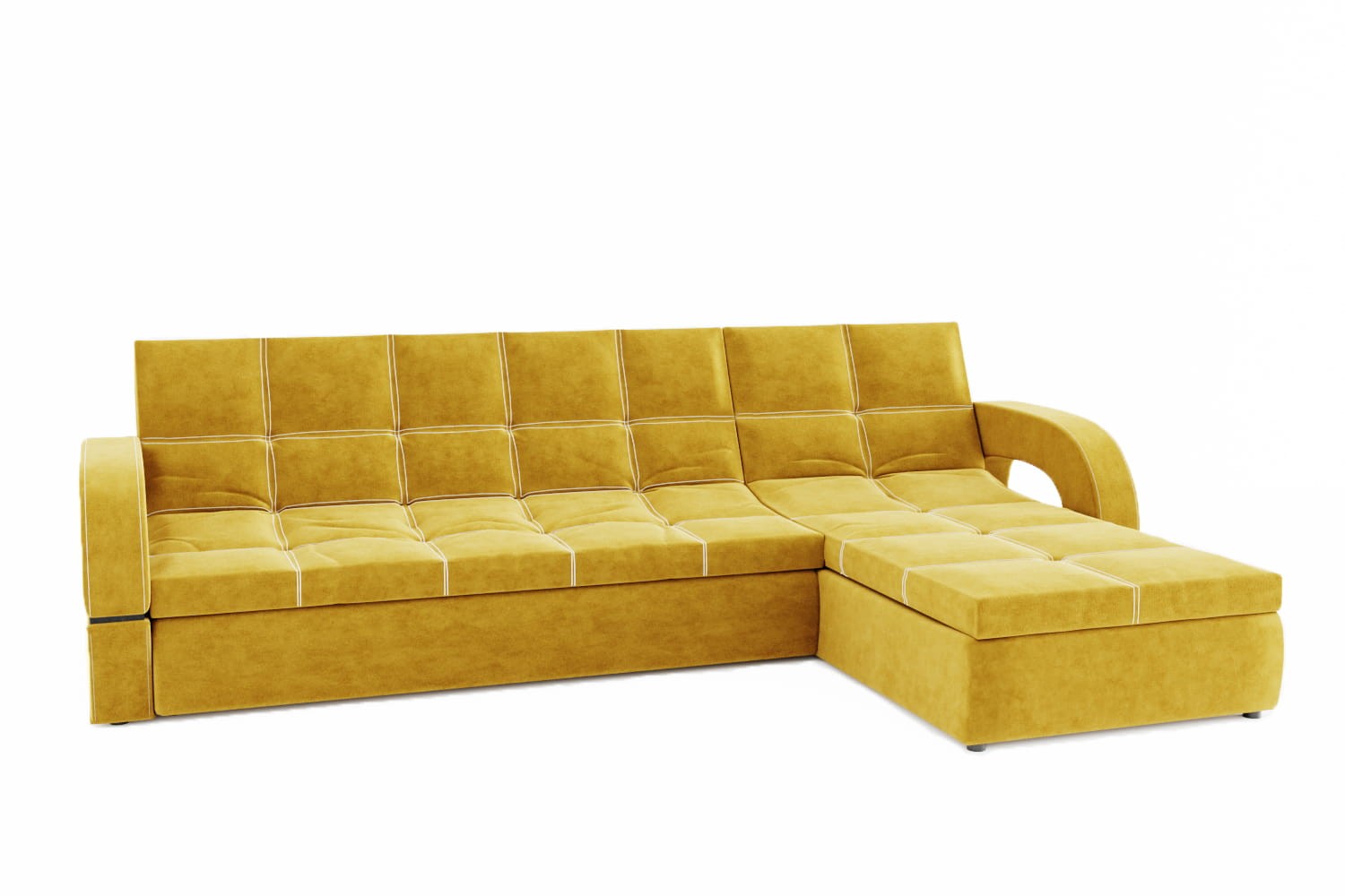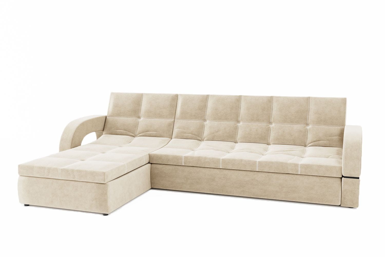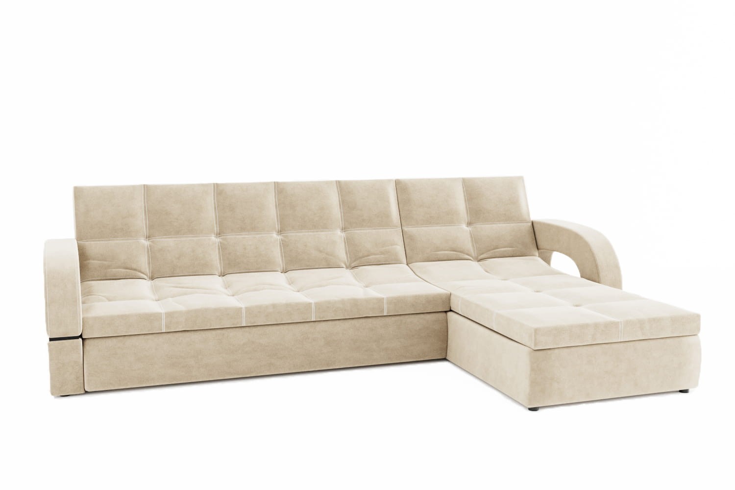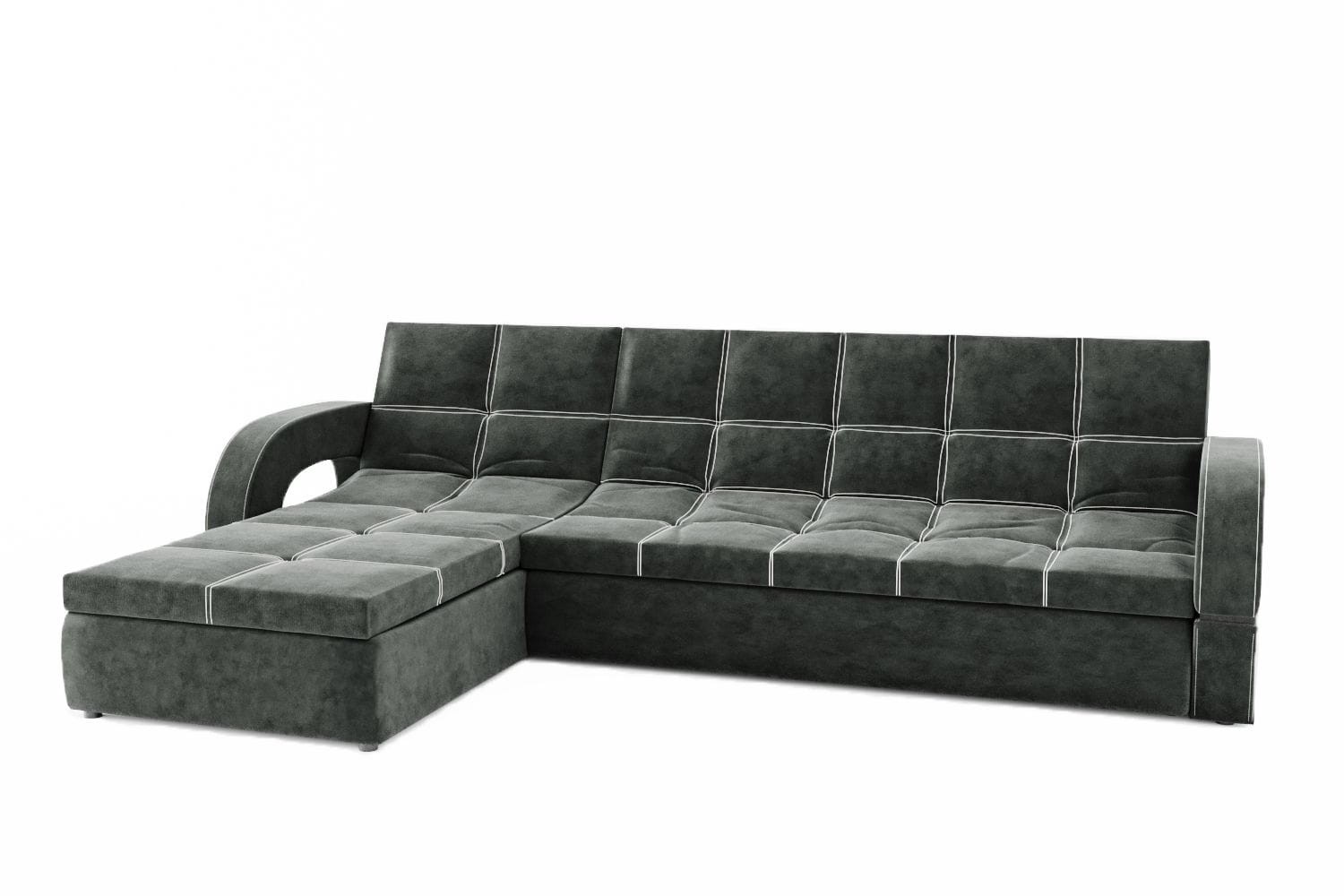 Особенности дивана: Каркас: ЛДСП, фанера, брус. Эргономичная мебель, позволяющая создать стильный интерьер. Обит качественным и плотным текстилем. Опорные элементы каркаса помогают равномерно распределять вес, благодаря чему напольное покрытие не продавливается. Механизм трансформации позволяет быстро и без особых напряжений превратить диван в удобное спальное место. Глубина дивана без учёта оттоманки: 1050 мм.